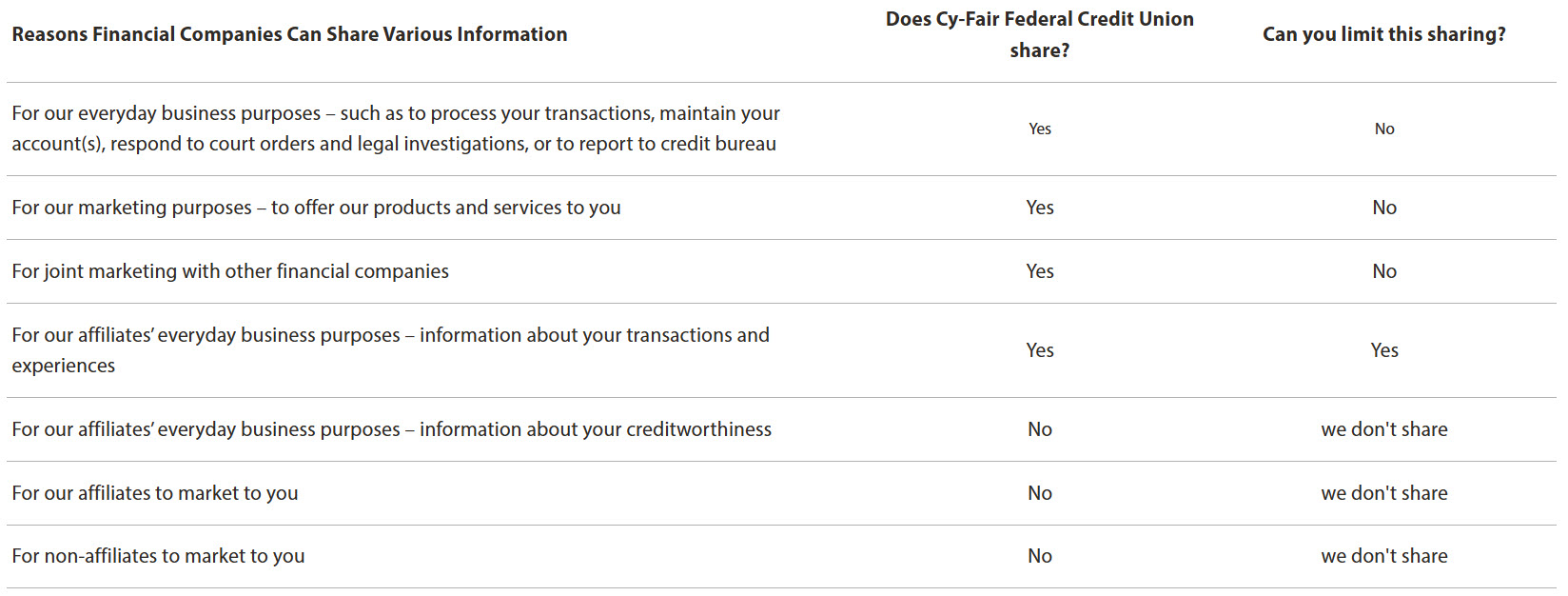 Reasons Financial Companies Can Share Various InformationDoes Cy-Fair Federal Credit Union share?Can you limit this sharing?For our everyday business purposes – such as to process your transactions, maintain your account(s), respond to court orders and legal investigations, or to report to credit bureauYesNoFor our marketing purposes – to offer our products and services to youYesNoFor joint marketing with other financial companiesYesNoFor our affiliates’ everyday business purposes – information about your transactions and experiencesYesYesFor our affiliates’ everyday business purposes – information about your creditworthinessNowe don't shareFor our affiliates to market to youNowe don't shareFor non-affiliates to market to youNowe don't share